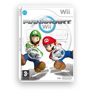 Mario Kart is a racing game with characters and setting elements from the Super Mario Bros. universe. This edition, for the Nintendo Wii system, has a total of 32 tracks, 16 from previous Mario Kart games and 16 created for this game. Players can choose from among 24 characters (such as Mario, Baby Peach, Toad, and Donkey Kong) and several different vehicles (depending on the selected character’s size). Characters are controlled using either a Wii remote-joystick combination or a plastic steering wheel in which a remote is placed. There are several different modes of play—solo, one-player against the computer, and multiplayer (against either only other humans or with computer-controlled characters, too). Multiplayer games can be done in-person (with up to four players racing at once on the same Wii), online (with friends or strangers around the world), or in some combination of these. In addition to races, there are two kinds of “battles” in which characters drive around an arena either collecting coins or trying to avoid getting the balloons on the backs of their vehicles popped.